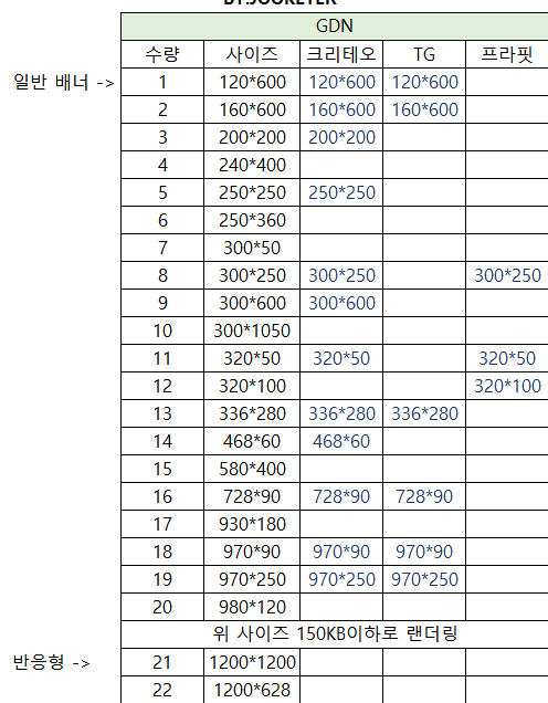 *GDN, 크리테오, TG(타겟팅게이츠) , 프라핏, GFA, 카카오모먼트, 페이스북 사이즈가 있습니다.