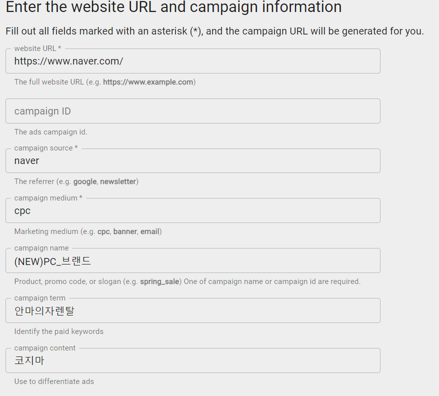 url / naver(소스) / sa(매체) / 캠페인 이름(mo/pc여부를 많이 넣어요)/ 콘텐츠 이름(상품명 등) / 키워드