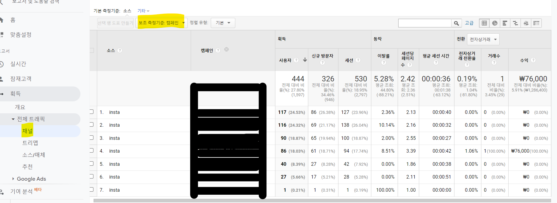 UA에서는 획득 > 채널 > INSTA (매체명)> 보조측정기준: 캠페인에서 확인을 했습니다.