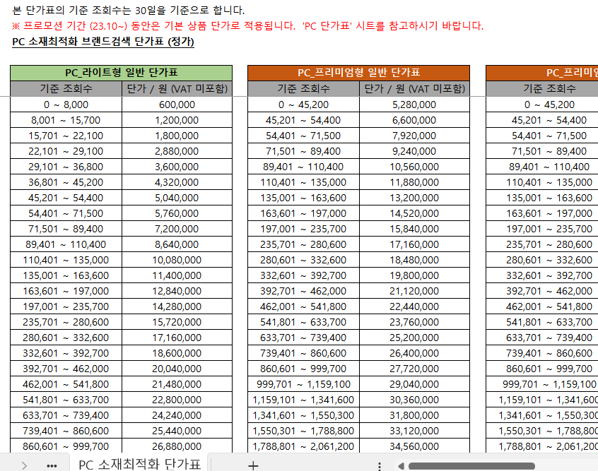-금액 : 프로모션 기간 종료 후 기준 PC/MO 모두 최소 60만원(VAT별도가)부터로