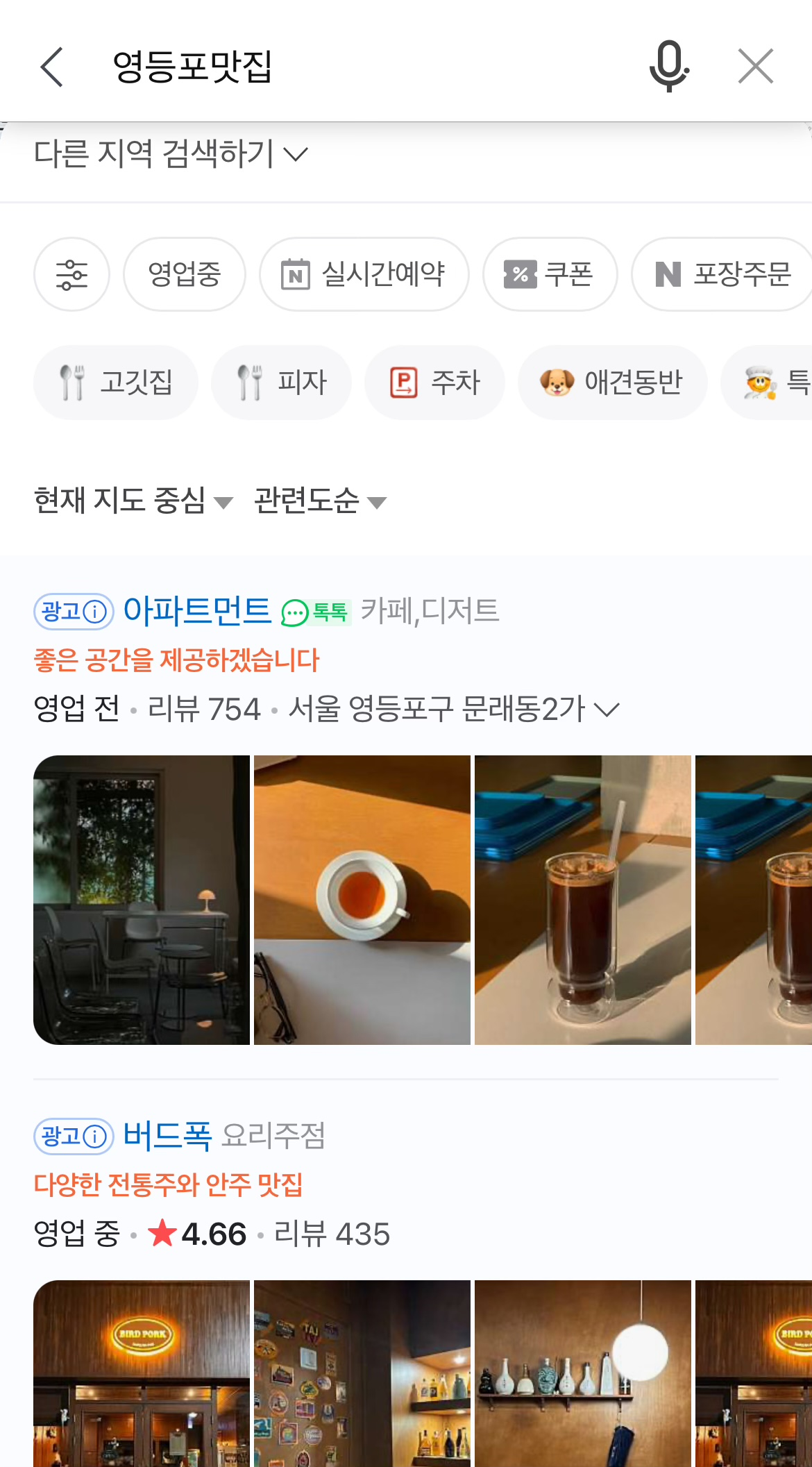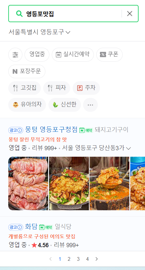 예를 들어 영등포 맛집이라고 검색을 하면 하기와 같이 광고라고 기재되고 우선적으로