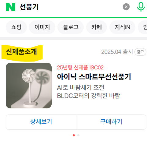 하기 이미지와 같이 "선풍기" 키워드 검색시에 신제품소개라는 란 하단에 들어가는 광고입니다.