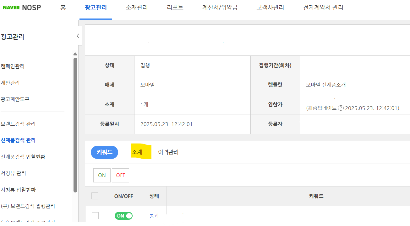 - 소재 셋팅 하는 법 : 캠페인 관리 > 캠페인 선택 > 키워드 선택 하면 소재로 들어가집니다!